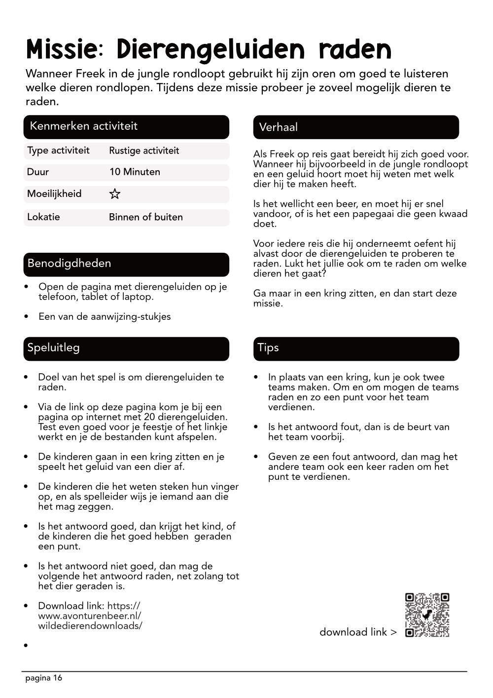 Voordat Freek op reis gaat bereidt hij zich altijd erg goed voor door allerlei trainingsmissies uit te voeren. Door zich goed voor te bereiden weet hij precies welke dieren hij tegen kan komen en hoe hij met deze dieren om moet gaan. Als wij nu met z’n allen de laatste missies van Freek nog een keer nadoen, dan komen we er vanzelf achter waar Freek is, en kunnen we hem redden.