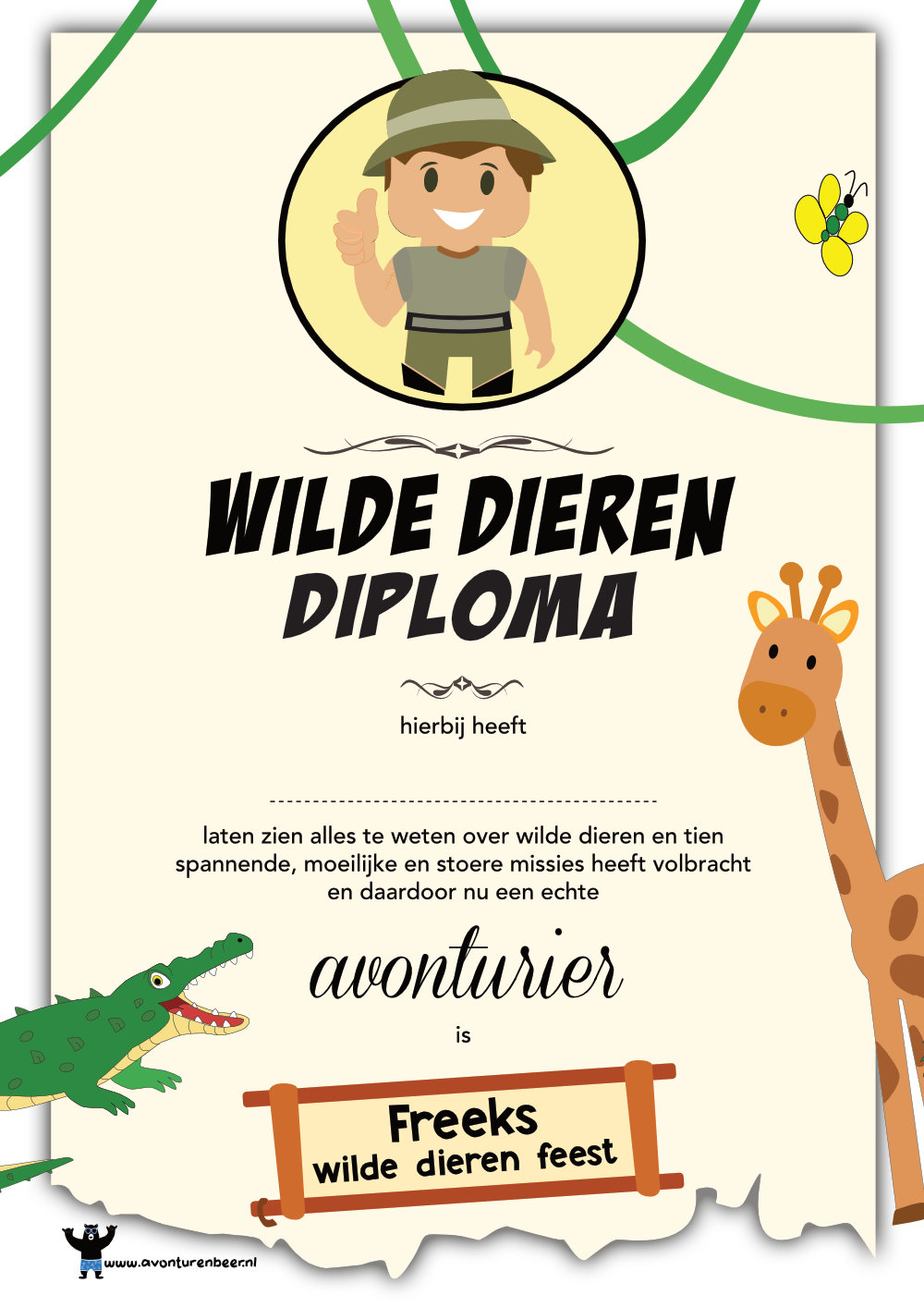 - Een diploma dat je aan alle avonturiers kunt overhandigen aan het einde van het feestje als ze alle missies goed hebben volbracht